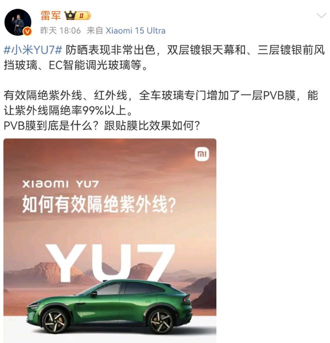 Lei Jun流行科学:小米YU7紫外线隔离率已达到99%